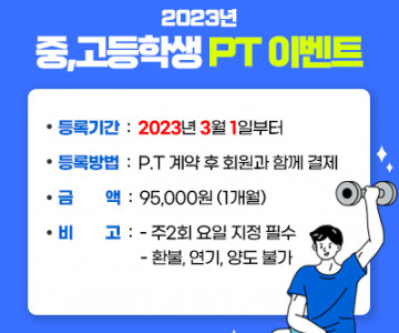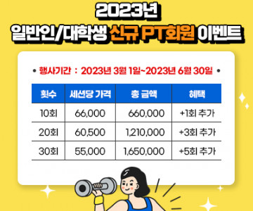 이벤트 검색대상 게시물 검색 검색어 검색 전체 2건 2023년 일반인 대학생 신규PT회원 이벤트 이벤트 기간 : 2023.03.24 ~ 2023.06.30 진행종료 2023년 중,고등학생 PT 이벤트 이벤트 기간 : 2023.03.24 ~ 2023.06.30 진행종료